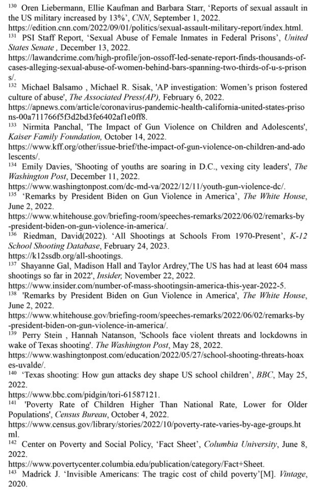 槍禍橫行威脅兒童生命安全。凱澤家庭基金會(huì)2022年10月14日發(fā)表報(bào)告指出,2011年至2021年,美國近18500名17歲及以下的兒童死于槍支暴力。2021年平均每天有7名兒童死于槍擊。(注133)《華盛頓郵報(bào)》2022年12月11日報(bào)道,2022年美國有超過5800名18歲以下的兒童因槍擊受傷或死亡。截至2022年12月1日,涉及兒童的致命槍擊事件比2021年增加了一倍多,涉及兒童的非致命槍擊事件也增加了80%以上。(注134)美國總統(tǒng)拜登2022年6月公開承認(rèn):“槍擊已成為美國兒童第一大死因,死于槍擊的兒童比死于車禍和癌癥的兒童還要多?!保ㄗ?35)