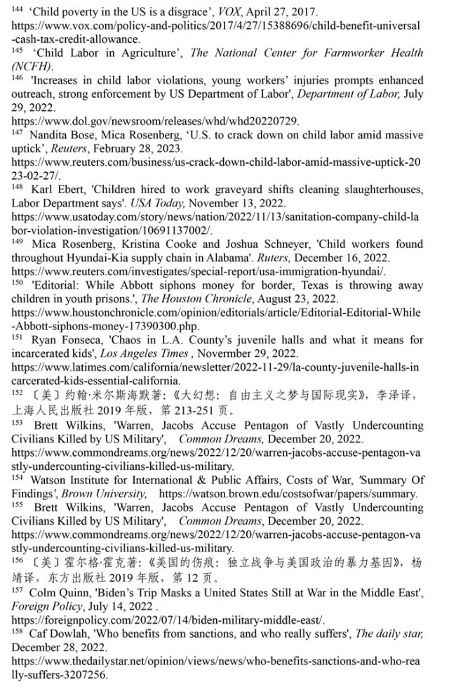 非法使用童工現(xiàn)象屢禁不止。根據(jù)非盈利組織“美國農(nóng)場工人健康中心”的數(shù)據(jù),美國有30萬至80萬名未成年人在農(nóng)場工作。(注145)美國《石板》網(wǎng)絡(luò)雜志指出,美國很多快餐店違反保護(hù)兒童健康與教育的規(guī)定,雇用青少年超時(shí)工作。童工問題屢禁不止,根源是美國法律體系存在漏洞。受新冠疫情和供應(yīng)鏈危機(jī)影響,美國多地出現(xiàn)“用工荒”現(xiàn)象,多州批準(zhǔn)新法案延長未成年人工作時(shí)間。根據(jù)美國勞工部的數(shù)據(jù),2022年,美國有數(shù)百萬青少年受雇在農(nóng)業(yè)、食品服務(wù)、零售、娛樂和建筑行業(yè)工作。(注146)路透社2023年2月28日報(bào)道,美國非法雇傭童工問題日益嚴(yán)重,自2018年以來,被非法雇用的童工激增了近70%。根據(jù)美國勞工部的數(shù)據(jù),2022財(cái)年有835家企業(yè)違法雇用3800名兒童,受雇專門從事危險(xiǎn)工作的兒童增加了26%。(注147)《今日美國報(bào)》2022年11月13日報(bào)道,威斯康星州帕克斯清潔服務(wù)公司雇用了30多名13至17歲的未成年人在肉類加工廠和農(nóng)場擔(dān)任清潔工。幾名未成年雇員在工作中受傷,其中一名13歲兒童被腐蝕性清潔化學(xué)品燒傷。(注148)路透社2022年12月16日報(bào)道,在阿拉巴馬州至少有四家汽車零部件供應(yīng)商被發(fā)現(xiàn)雇傭童工,勞務(wù)派遣機(jī)構(gòu)將未成年人移民安置在工廠工作。(注149)時(shí)至今日,美國仍是聯(lián)合國193個(gè)會(huì)員國中唯一沒有批準(zhǔn)《兒童權(quán)利公約》的國家,解決雇傭童工問題的前景依然黯淡。