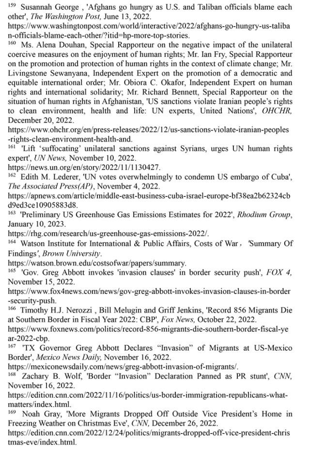 長期肆意實(shí)施單邊制裁。近年來,美國對其他國家實(shí)施的單邊制裁呈指數(shù)級增長,極大削弱了被制裁國家人權(quán)保障的能力與水平。孟加拉國《每日星報(bào)》2022年12月28日報(bào)道,美國實(shí)施的單邊制裁總數(shù)為世界之最,目前仍在對20多個(gè)國家實(shí)施制裁,包括1962年以來對古巴的制裁、1979年以來對伊朗的制裁、2011年以來對敘利亞的制裁,以及近年來對阿富汗的制裁,導(dǎo)致被制裁國家無法向其人民提供基本的食物和藥品。(注158)《華盛頓郵報(bào)》2022年6月13日報(bào)道,近一半的阿富汗人沒有足夠的食物,兒童營養(yǎng)不良呈上升趨勢。(注159)2022年12月20日,多名聯(lián)合國人權(quán)理事會(huì)獨(dú)立專家發(fā)表共同聲明指出,美國政府對伊朗的制裁加劇了伊朗的環(huán)境危害,使所有在伊朗的民眾無法充分享受健康權(quán)和生命權(quán),侵犯了伊朗人民享有清潔環(huán)境的權(quán)利。(注160)聯(lián)合國單邊強(qiáng)制措施對人權(quán)負(fù)面影響問題特別報(bào)告員阿萊娜·杜晗2022年11月10日指出,單邊制裁加劇了敘利亞人民的苦難,是對人權(quán)的嚴(yán)重侵犯。(注161)美國政府肆意實(shí)施制裁引發(fā)他國人權(quán)危機(jī)受到國際社會(huì)強(qiáng)烈譴責(zé)。2022年11月3日,聯(lián)合國大會(huì)就敦促美國終止對古巴的經(jīng)濟(jì)、商業(yè)和金融封鎖進(jìn)行投票表決。在193個(gè)成員國中,多達(dá)185個(gè)國家支持譴責(zé)美國對古巴的禁運(yùn)。(注162)這是聯(lián)合國大會(huì)連續(xù)30次通過類似決議。
