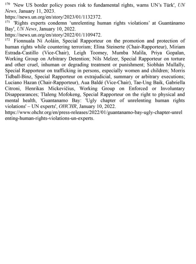 拒不關(guān)閉關(guān)塔那摩監(jiān)獄。2002年設(shè)立的關(guān)塔那摩監(jiān)獄最多時(shí)曾關(guān)押約780人,其中大多數(shù)人未經(jīng)審判便遭拘留,受到了殘忍的、不人道的待遇,是美國“肆意侵犯人權(quán)的一個(gè)丑陋篇章”。(注171)聯(lián)合國人權(quán)理事會(huì)在反恐中促進(jìn)和保障人權(quán)問題特別報(bào)告員菲奧努阿拉·尼奧萊因等多名獨(dú)立專家2022年1月發(fā)表共同聲明指出,臭名昭著的關(guān)塔那摩監(jiān)獄是美國在人權(quán)保護(hù)上的污點(diǎn),要求美國政府關(guān)閉關(guān)塔那摩監(jiān)獄,對遭受酷刑、任意拘留的公民進(jìn)行賠償,并根據(jù)國際法追究授權(quán)和實(shí)施酷刑的人員的責(zé)任。(注172)