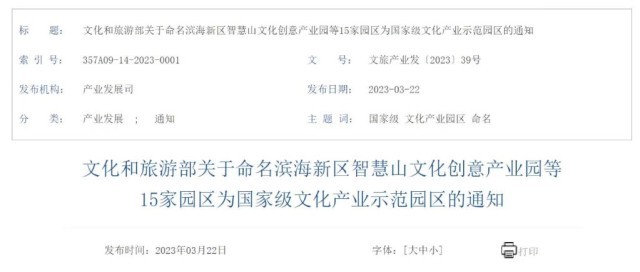 根據(jù)文化和旅游部關于命名濱海新區(qū)智慧山文化創(chuàng)意產(chǎn)業(yè)園等15家園區(qū)為國家級文化產(chǎn)業(yè)示范園區(qū)的通知,此次新獲命名的園區(qū)包括天津市濱海新區(qū)智慧山文化創(chuàng)意產(chǎn)業(yè)園、河北省中國曲陽雕塑文化產(chǎn)業(yè)園、江蘇省南京秦淮特色文化產(chǎn)業(yè)園、浙江省衢州儒學文化產(chǎn)業(yè)園、湖南省馬欄山視頻文創(chuàng)產(chǎn)業(yè)園、西藏自治區(qū)西藏文化旅游創(chuàng)意園區(qū)等。