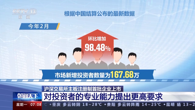 根據(jù)中國(guó)結(jié)算公布的最新數(shù)據(jù),今年2月,市場(chǎng)新增投資者數(shù)量為167.68萬(wàn),環(huán)比增加98.48%,這是時(shí)隔4個(gè)月之后,市場(chǎng)單月新增投資者數(shù)量再次超過(guò)百萬(wàn)。截至2月末,我國(guó)A股投資者已達(dá)到2.14億。專家表示,全面實(shí)行注冊(cè)制,一些市場(chǎng)規(guī)則隨之調(diào)整,投資者需要審慎進(jìn)行判斷。
