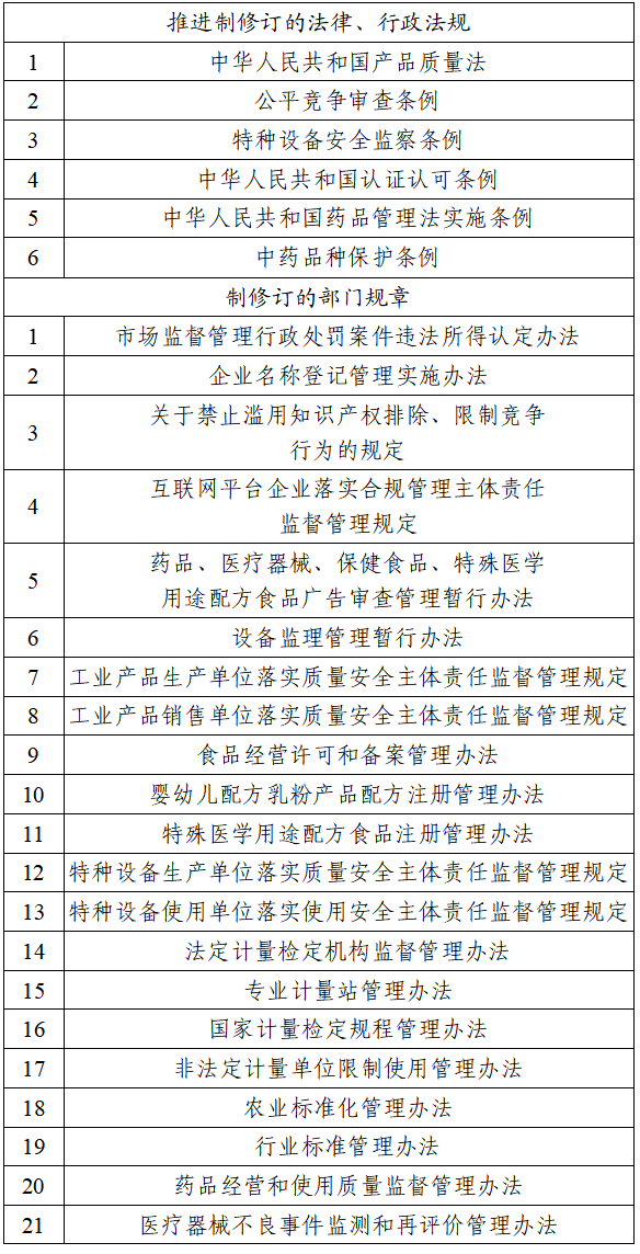 重點圍繞四個方面作出部署:一是深入實施公平競爭政策,不斷優(yōu)化公平競爭環(huán)境,積極推動《公平競爭審查條例》的制定,修訂《關(guān)于禁止濫用知識產(chǎn)權(quán)排除、限制競爭行為的規(guī)定》等規(guī)章。二是持續(xù)推進市場準(zhǔn)入準(zhǔn)營退出便利化,不斷優(yōu)化營商環(huán)境,切實提升平臺經(jīng)濟常態(tài)化監(jiān)管水平,制修訂《企業(yè)名稱登記管理實施辦法》《互聯(lián)網(wǎng)平臺企業(yè)落實合規(guī)管理主體責(zé)任監(jiān)督管理規(guī)定》《藥品、醫(yī)療器械、保健食品、特殊醫(yī)學(xué)用途配方食品廣告審查管理暫行辦法》等規(guī)章。三是嚴(yán)格落實“三品一特”安全責(zé)任,進一步強化市場監(jiān)管領(lǐng)域安全保障,積極推動《特種設(shè)備安全監(jiān)察條例》《藥品管理法實施條例》《中藥品種保護條例》等行政法規(guī)的修訂,制修訂《食品經(jīng)營許可和備案管理辦法》《設(shè)備監(jiān)理管理暫行辦法》《特種設(shè)備生產(chǎn)單位落實質(zhì)量安全主體責(zé)任監(jiān)督管理規(guī)定》《藥品經(jīng)營和使用質(zhì)量監(jiān)督管理辦法》等規(guī)章。四是充分發(fā)揮質(zhì)量支撐作用,加快推進質(zhì)量強國建設(shè),積極推動《產(chǎn)品質(zhì)量法》《認證認可條例》的修訂,修訂《國家計量檢定規(guī)程管理辦法》《行業(yè)標(biāo)準(zhǔn)管理辦法》等規(guī)章。