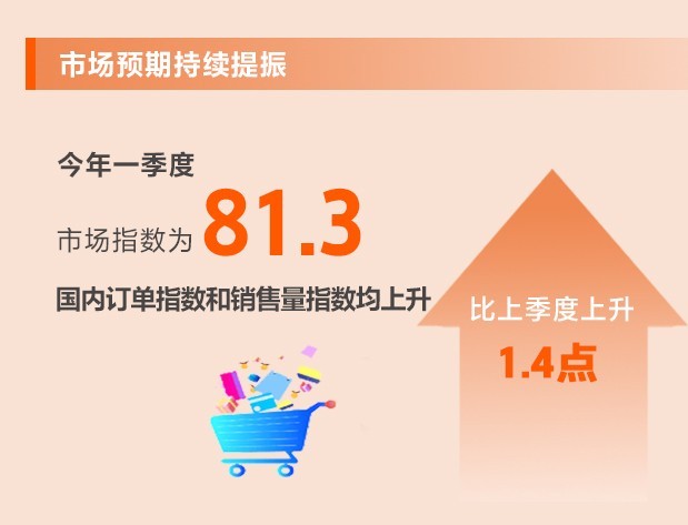 今年以來經(jīng)濟(jì)循環(huán)加快暢通,市場需求逐步恢復(fù),消費(fèi)勢頭有所好轉(zhuǎn),市場預(yù)期明顯恢復(fù)。一季度,市場指數(shù)為81.3,環(huán)比上升1.4點。所調(diào)查的8個行業(yè)中,國內(nèi)訂單指數(shù)和銷售量指數(shù)均上升,7個行業(yè)銷售價格指數(shù)上升。