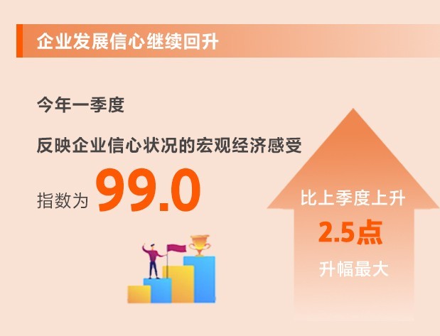今年以來,我國經(jīng)濟(jì)運(yùn)行持續(xù)回暖,增長動能不斷釋放,發(fā)展信心明顯增強(qiáng)。一季度,反映企業(yè)信心狀況的宏觀經(jīng)濟(jì)感受指數(shù)為99.0,比上季度上升2.5點,升幅最大。從宏觀經(jīng)濟(jì)感受指數(shù)的細(xì)項看,宏觀感受指數(shù)為103.6,比上季度上升2.4點,高于景氣臨界值100;行業(yè)運(yùn)行指數(shù)為94.3,比上季度上升2.6點,升幅較大。