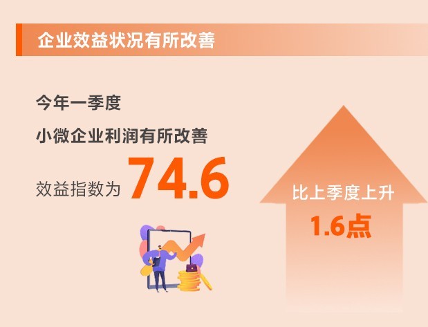 企業(yè)生產(chǎn)經(jīng)營加速恢復(fù),原材料價格漲幅收窄,以及延續(xù)優(yōu)化減稅降費(fèi)政策減輕企業(yè)負(fù)擔(dān),小微企業(yè)利潤有所改善。一季度,效益指數(shù)為74.6,比上季度上升1.6點,反彈幅度較大,但仍處于歷史較低位。所調(diào)查的8個行業(yè)效益指數(shù)均有所上升。