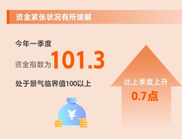 央行降準(zhǔn)以及指導(dǎo)金融機(jī)構(gòu)繼續(xù)支持小微企業(yè),多措并舉“精準(zhǔn)滴灌”,小微企業(yè)融資狀況不斷改善。一季度,資金指數(shù)為101.3,比上季度上升0.7點,處于景氣臨界值100以上。其中,流動資金指數(shù)為86.3,比上季度上升1.1點;融資指數(shù)為90.8,環(huán)比上升0.5點。所調(diào)查的8個行業(yè)中,8個行業(yè)流動資金指數(shù)、6個行業(yè)融資指數(shù)均上升。