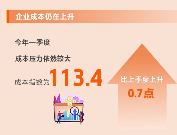 全球通脹仍處于高位,美聯(lián)儲急速加息對世界經(jīng)濟(jì)影響的外溢效應(yīng)持續(xù)顯現(xiàn)。中小企業(yè)多位于產(chǎn)業(yè)鏈下游且面對消費(fèi)者,需求疲弱情況下難以轉(zhuǎn)嫁上游原材料價格上漲的壓力,同時還面臨人力成本上行以及房屋租金較高等困難。一季度,成本指數(shù)為113.4,比上季度上升0.7點,仍處于不景氣區(qū)間,說明成本壓力依然較大。所調(diào)查的8個行業(yè)中,7個行業(yè)生產(chǎn)成本指數(shù)、8個行業(yè)勞動力成本指數(shù)均上升。