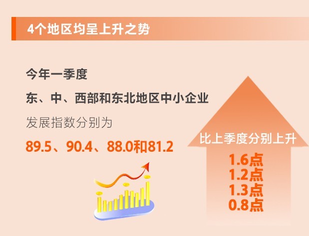 一季度,東、中、西部和東北地區(qū)中小企業(yè)發(fā)展指數(shù)分別為89.5、90.4、88.0和81.2,比上季度分別上升1.6、1.2、1.3和0.8點,東部地區(qū)指數(shù)上升幅度最大,中部地區(qū)指數(shù)最高,說明東部和中部地區(qū)經(jīng)濟(jì)和中小微企業(yè)恢復(fù)較快。
