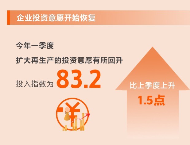 各地投向基礎(chǔ)領(lǐng)域、短板領(lǐng)域、科技創(chuàng)新領(lǐng)域的項目和計劃增多,企業(yè)對未來的信心有所增強(qiáng),擴(kuò)大再生產(chǎn)的投資意愿有所回升。一季度,投入指數(shù)為83.2,比上季度上升1.5點,所調(diào)查的8個行業(yè)投入指數(shù)均上升。