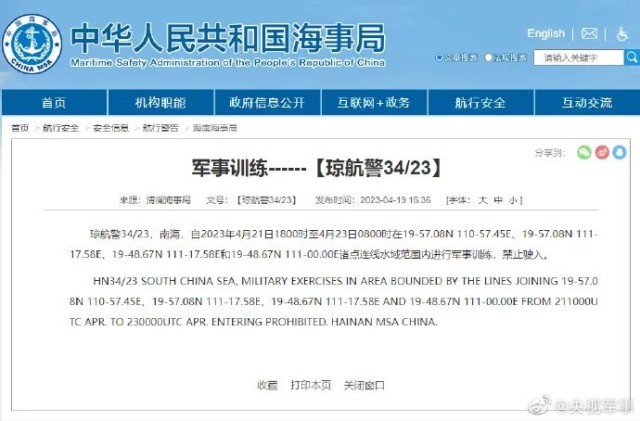 據(jù)中國海事局網(wǎng)站消息,清瀾海事局發(fā)布航行警告,自4月21日18時(shí)至4月23日8時(shí),南海部分海域進(jìn)行軍事訓(xùn)練,禁止駛?cè)搿?/p>