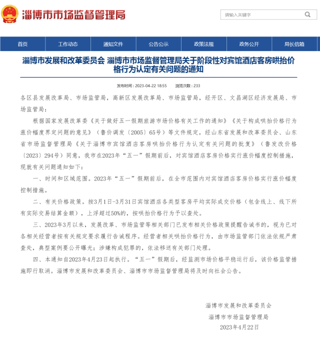 根據國家發(fā)展改革委《關于做好五一假期旅游市場價格有關工作的通知》《關于構成哄抬價格行為漲價幅度界定問題的意見》(魯價調發(fā)〔2005〕65號)等文件規(guī)定,經山東省發(fā)展和改革委員會、山東省市場監(jiān)督管理局《關于淄博市賓館酒店客房哄抬價格行為認定有關問題的批復》(魯發(fā)改價格〔2023〕294號)同意,我市在2023年“五一”假期前后,對賓館酒店客房價格實行漲價幅度控制措施,現就有關問題通知如下: