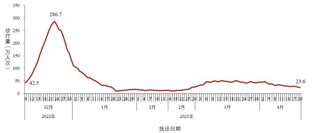 ?。ㄒ唬┛傮w就診人數(shù)結(jié)果。全國(不含港澳臺)發(fā)熱門診(診室)就診人數(shù)于2022年12月23日達(dá)到峰值286.7萬人次,隨后連續(xù)下降;2023年1月23日后就診人數(shù)呈現(xiàn)低位波動(dòng),約6周(2月24日-4月6日)的波動(dòng)增加及平臺波動(dòng)后,近2周(4月7日-4月20日)呈下降趨勢,4月20日為23.6萬人次,較峰值下降了91.8%(圖2-1)。