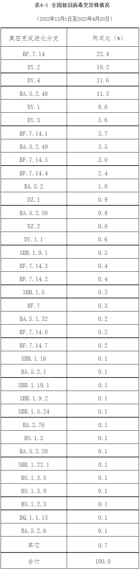 ?。ǘ?2月以來本土病例病毒變異株監(jiān)測情況。2022年12月1日至2023年4月20日,全國共報(bào)送32993例本土病例新冠病毒基因組有效序列,均為奧密克戎變異株,涵蓋117個(gè)進(jìn)化分支。主要流行株為BA.5.2及其亞分支(構(gòu)成比64.3%)和BF.7及其亞分支(構(gòu)成比33.0%)等。其中,BA.5.2及其亞分支包括DY.2(19.2%)、DY.4(11.6%)、BA.5.2.48(11.3%)、DY.1(8.6%)、DY.3(5.6%)和BA.5.2.49(3.5%)等;BF.7及其亞分支包括BF.7.14(22.4%)、BF.7.14.1(3.7%)、BF.7.14.5(3.0%)、BF.7.14.4(2.4%)、BF.7.14.3(0.4%)和BF.7.14.2(0.3%)等(表4-1)。共監(jiān)測到本土重點(diǎn)關(guān)注變異株603例,其中,4例BQ.1、4例BQ.1.1、19例BQ.1.1.13、1例BQ.1.1.17、1例BQ.1.1.18、1例BQ.1.1.35、1例BQ.1.1.38、1例BQ.1.1.46、1例BQ.1.1.53、2例BQ.1.1.66、1例BQ.1.1.69、8例BQ.1.2、1例BQ.1.23、2例BQ.1.8、2例CH.1.1、3例CH.1.1.1、1例CH.1.1.11、1例DT.2、1例EA.1、2例EG.1、3例EL.1、7例EM.1、1例EU.1.1、2例FB.1、3例FE.1、1例XBB、4例XBB.1、2例XBB.1.11.1、1例XBB.1.12、4例XBB.1.15、42例XBB.1.16、5例XBB.1.16.1、16例XBB.1.17.1、37例XBB.1.19.1、2例XBB.1.22、22例XBB.1.22.1、1例XBB.1.23、5例XBB.1.24、1例XBB.1.4、109例XBB.1.5、2例XBB.1.5.11、9例XBB.1.5.12、2例XBB.1.5.15、7例XBB.1.5.23、35例XBB.1.5.24、1例XBB.1.5.28、1例XBB.1.5.32、1例XBB.1.5.36、1例XBB.1.5.5、2例XBB.1.5.7、2例XBB.1.9、163例XBB.1.9.1、35例XBB.1.9.2、1例XBB.1.9.3、1例XBB.1.9.5、11例XBB.2.3、1例XBB.2.3.2、1例XBB.2.4和2例XBB.3。