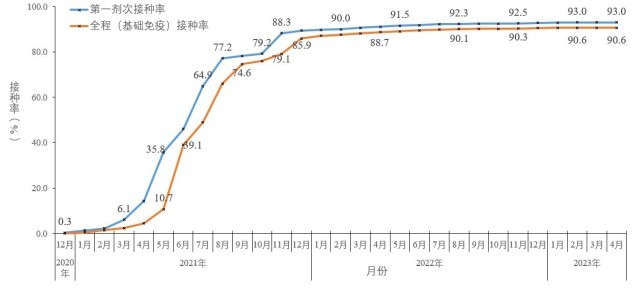 截至2023年4月20日,31個(gè)?。ㄗ灾螀^(qū)、直轄市)和新疆生產(chǎn)建設(shè)兵團(tuán)累計(jì)報(bào)告接種新冠病毒疫苗349443.2萬劑次(圖5-1)。接種總?cè)藬?shù)131048.0萬人,完成全程接種127708.4萬人,完成第一劑次加強(qiáng)免疫接種82783.9萬人。全人群第一劑次、全程接種覆蓋比例分別達(dá)到93.0%和90.6%(圖5-2)。60歲以上老年人累計(jì)報(bào)告接種新冠病毒疫苗68083.7萬劑次,接種總?cè)藬?shù)24169.3萬人,完成全程接種23036.1萬人,完成第一劑次加強(qiáng)免疫接種19318.9萬人。
