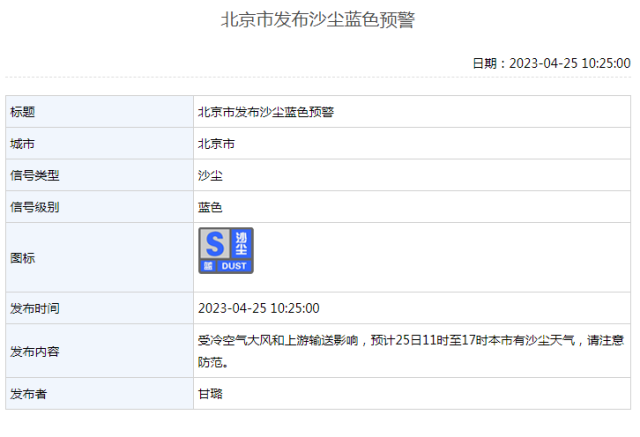 2023年04月25日10時(shí)25分,北京市氣象臺(tái)發(fā)布沙塵藍(lán)色預(yù)警。