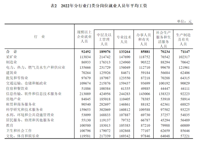 2022年分行業(yè)門類分崗位就業(yè)人員年平均工資。來源:國(guó)家統(tǒng)計(jì)局