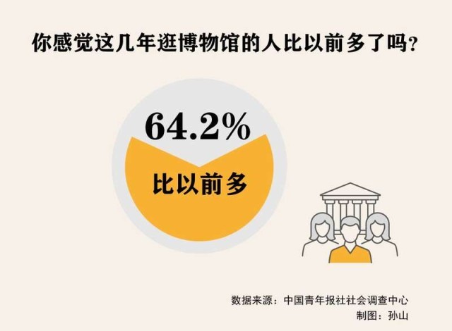 中青報(bào)社調(diào)中心的調(diào)查也顯示,超六成(64.2%)受訪者感覺(jué)這幾年逛博物館的人比以前多了。七成多(73.2%)受訪者表示去外地游玩,會(huì)把目的地博物館納入必到之地。