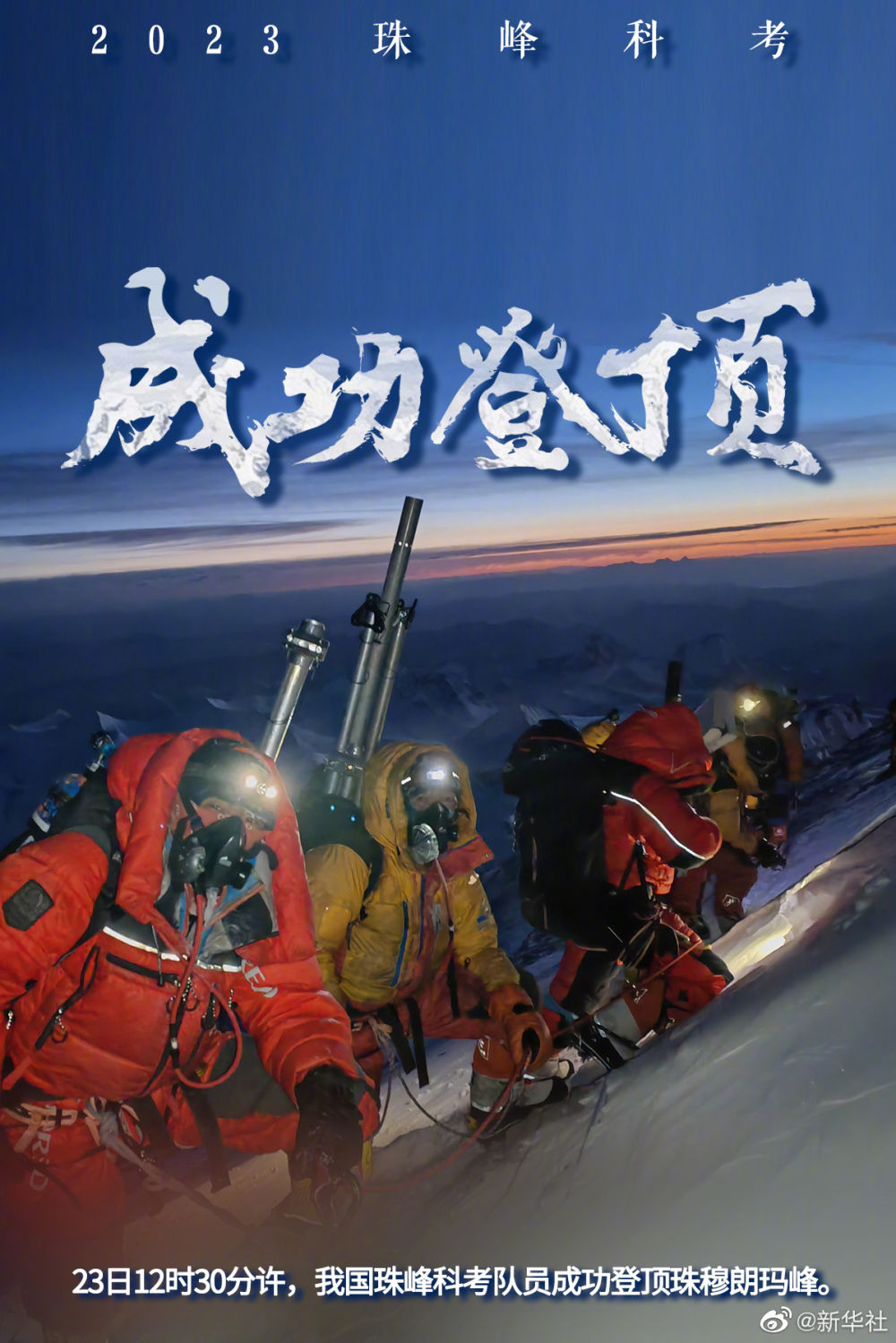 23日12時30分許,2023年珠峰科考13名科考登頂隊員成功登頂珠穆朗瑪峰。這是我國珠峰科考繼2022年之后,再次突破8000米以上海拔高度。(記者:陳尚才 田金文 聶毅 新華社特約記者拉巴)