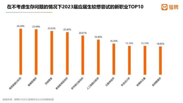 在求職偏好方面,調(diào)研顯示,超5成應(yīng)屆生首份工作期待月薪為5千-1萬(wàn)元,超6成期待三年后月薪1萬(wàn)-2萬(wàn)元。當(dāng)問及應(yīng)屆生在不考慮生存問題的情況下較想嘗試哪些新職業(yè)?答復(fù)中位居前五的是商務(wù)數(shù)據(jù)分析師、健康管理師、民宿管家、家庭教育指導(dǎo)師、研學(xué)旅行指導(dǎo)師,得票率均超20%。