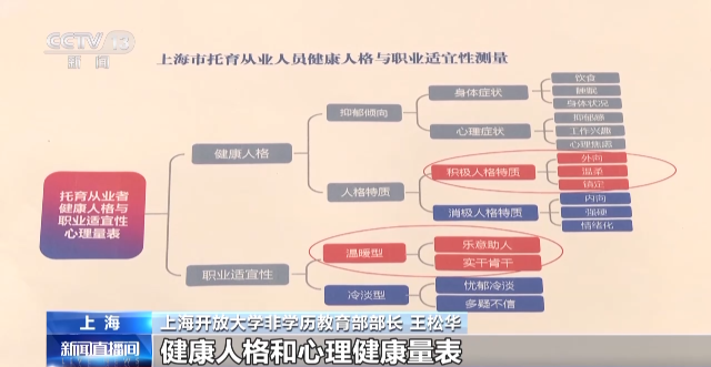 上海開放大學(xué)非學(xué)歷教育部部長 王松華:我們用專門研發(fā)的健康人格和心理健康量表,從兩個維度八個方面,用92道題目對他們進行測量。根據(jù)測量結(jié)果,對輕度不適宜的,我們將組織心理輔導(dǎo)專家對他們進行輔導(dǎo),對重度不適宜的人群,我們將提出勸退建議,不建議他們從事這個崗位。