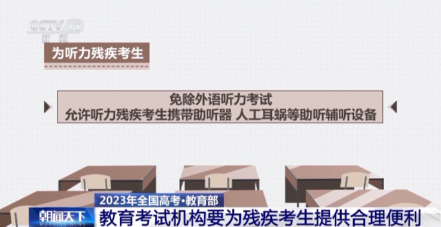 為聽力殘疾考生免除外語聽力考試。允許聽力殘疾考生攜帶助聽器、人工耳蝸等助聽輔聽設備。