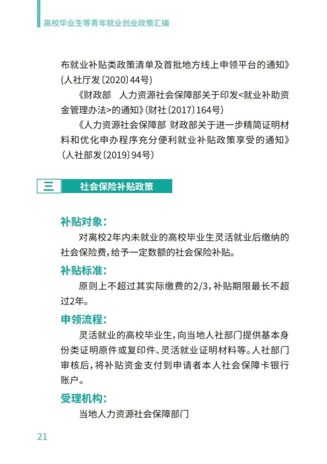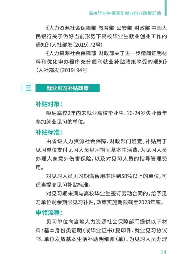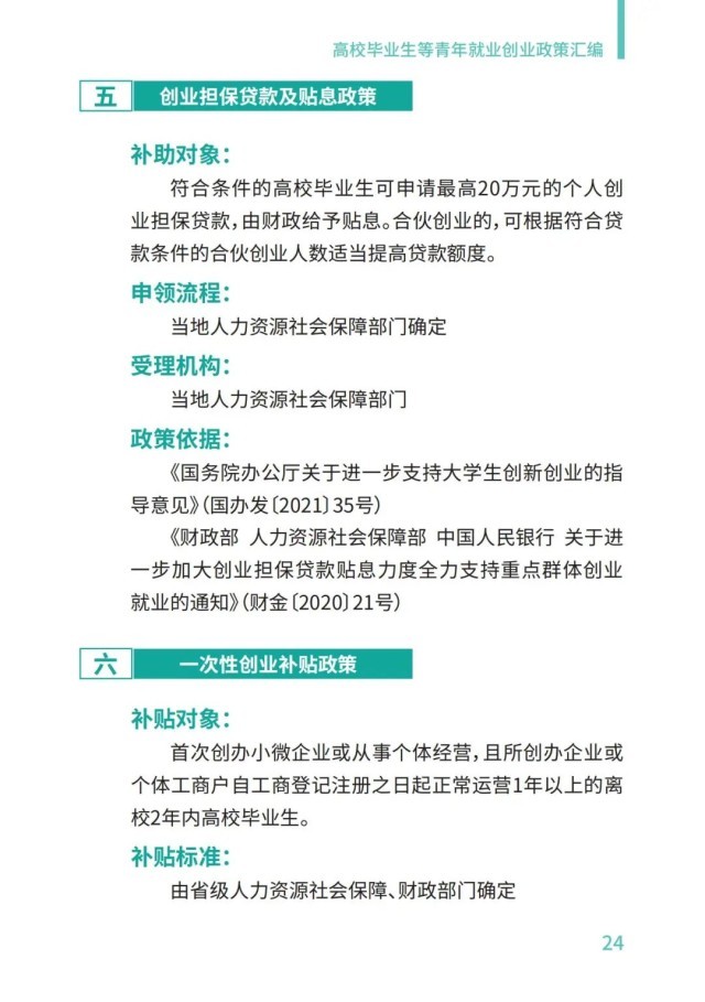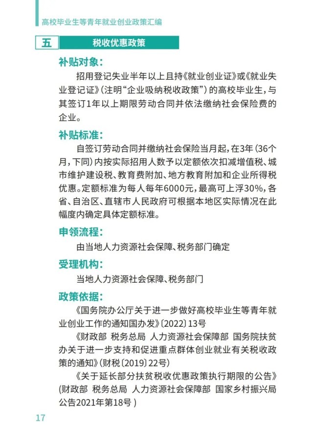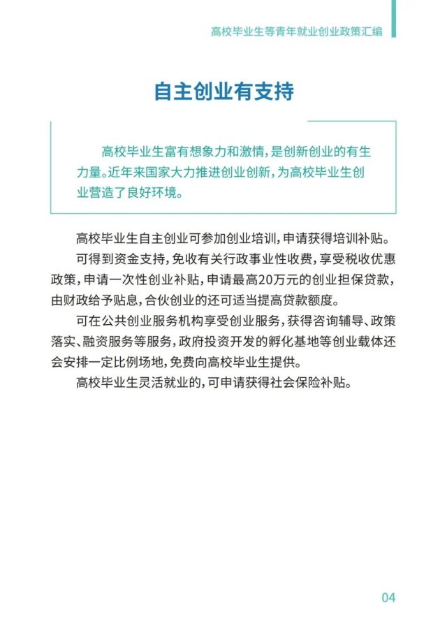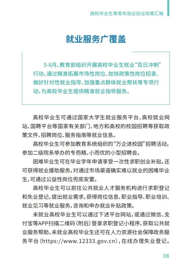 《匯編》系統(tǒng)梳理了國家有關(guān)部門出臺的促進高校畢業(yè)生就業(yè)創(chuàng)業(yè)現(xiàn)行政策,聚焦高校畢業(yè)生求職就業(yè)需求,分為企業(yè)就業(yè)、基層就業(yè)、自主創(chuàng)業(yè)、能力提升、應(yīng)征入伍、就業(yè)見習(xí)、就業(yè)服務(wù)、就業(yè)手續(xù)、權(quán)益維護等九方面內(nèi)容。為便于高校畢業(yè)生和企業(yè)快速查閱相關(guān)政策,《匯編》還歸納整理了就業(yè)有關(guān)政策清單,包括6項面向企業(yè)(單位)吸納高校畢業(yè)生就業(yè)的補貼、稅收優(yōu)惠等政策,以及9項面向高校畢業(yè)生的補貼、資助等政策。