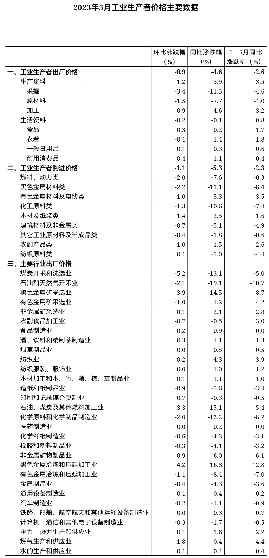 6月15日,國家統(tǒng)計局發(fā)布消息,2023年5月份,全國工業(yè)生產(chǎn)者出廠價格同比下降4.6%,環(huán)比下降0.9%;工業(yè)生產(chǎn)者購進價格同比下降5.3%,環(huán)比下降1.1%。1—5月平均,工業(yè)生產(chǎn)者出廠價格比去年同期下降2.6%,工業(yè)生產(chǎn)者購進價格下降2.3%。