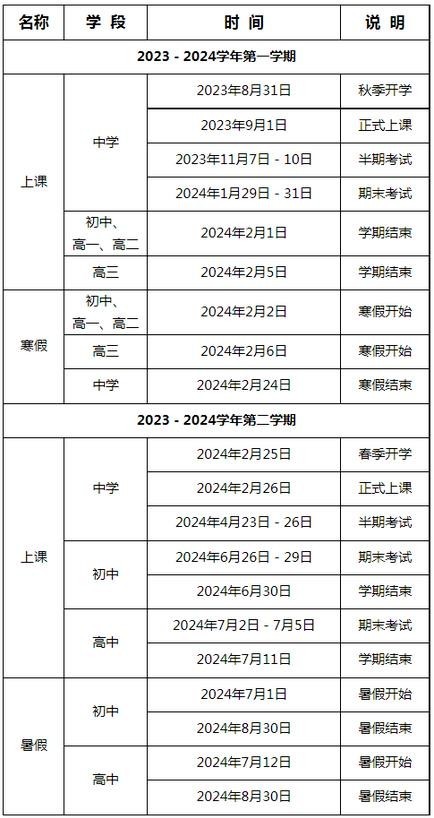 新學(xué)期開學(xué)時(shí)間:秋季學(xué)期,高三年級(jí)于2023年8月24日開學(xué);其他年級(jí)(含幼兒園)于8月31日?qǐng)?bào)名,9月1日正式上課。