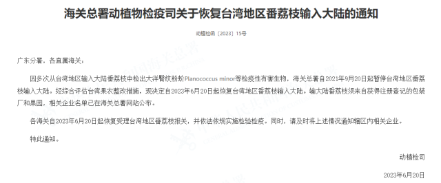 央視網(wǎng)消息:據(jù)海關(guān)總署網(wǎng)站消息,發(fā)布海關(guān)總署動植物檢疫司關(guān)于恢復(fù)臺灣地區(qū)番荔枝輸入大陸的通知。