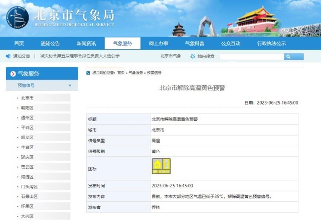 央視網(wǎng)消息:據(jù)北京市氣象局消息,目前,本市大部分地區(qū)氣溫已低于35℃,解除高溫黃色預(yù)警信號。