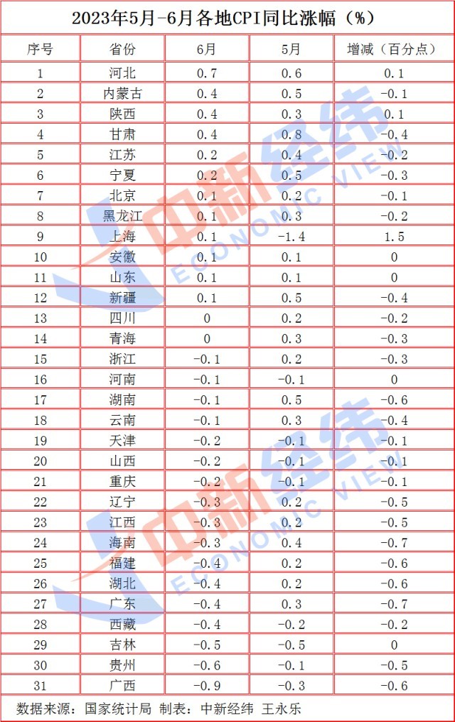 中新經(jīng)緯7月12日電 (王永樂)日前,國家統(tǒng)計局公布了31省份2023年6月居民消費價格指數(shù)(CPI)。中新經(jīng)緯梳理發(fā)現(xiàn),6月,17省份CPI同比下降。其中,吉林、山西、貴州和河南等4省份物價連續(xù)三個月回落。