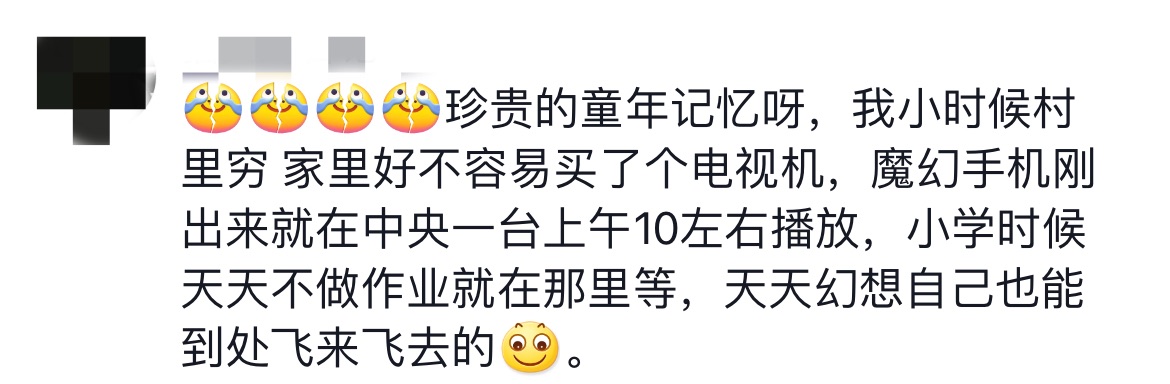 一名網(wǎng)友稱《魔幻手機(jī)》是自己珍貴的童年記憶,當(dāng)年家里好不容易買了電視機(jī),小學(xué)時天天守在電視機(jī)前等待播出,“天天幻想自己也能到處飛來飛去”。