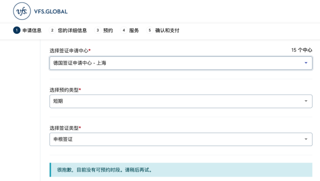 如在威孚仕官網(wǎng),在國內多個城市的德國簽證申請中心申請短期申根簽證都顯示“目前沒有可預約時段”。