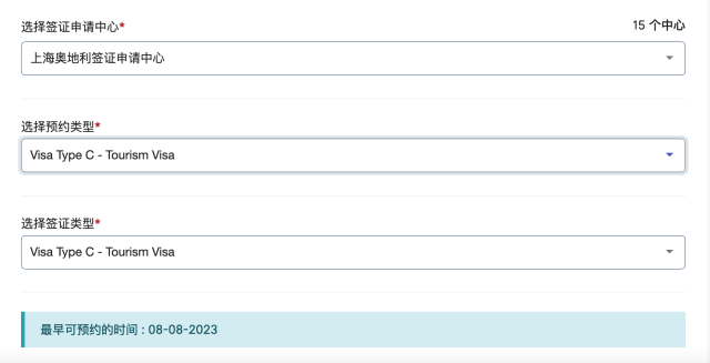 上海奧地利簽證申請中心能預約到8月上旬送簽,算上7-10個工作日的簽證辦理周期,尚能趕在暑期末尾出行。