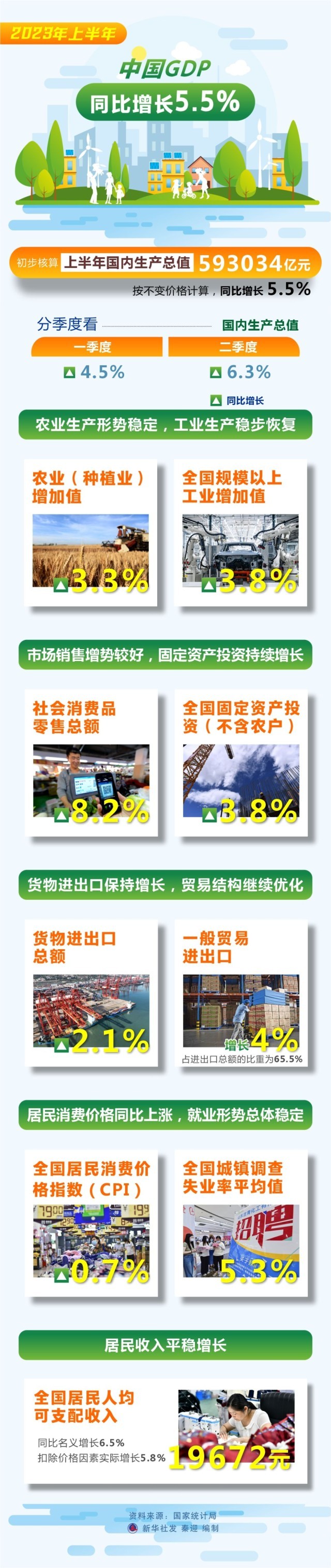 翻開半年報,國內(nèi)生產(chǎn)總值比去年同期增長5.5%,社會消費品零售總額同比增長8.2%,第三產(chǎn)業(yè)增加值同比增長6.4%……多項指標顯示,我國經(jīng)濟運行延續(xù)恢復向好態(tài)勢,同時物價、出口等部分指標增速放緩也引發(fā)關注。
