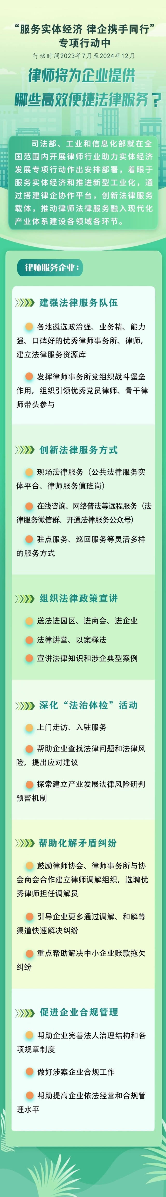 日前,司法部、工業(yè)和信息化部聯(lián)合印發(fā)《“服務(wù)實(shí)體經(jīng)濟(jì) 律企攜手同行”專項(xiàng)行動(dòng)方案》,就在全國(guó)范圍內(nèi)開(kāi)展律師行業(yè)助力實(shí)體經(jīng)濟(jì)發(fā)展專項(xiàng)行動(dòng)作出安排部署。