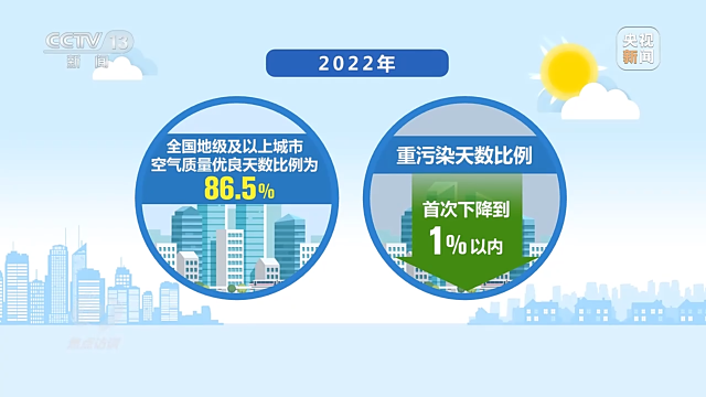 不僅北京,十年來,全國重點城市PM2.5平均濃度下降57%。2022年,全國地級及以上城市空氣質量優(yōu)良天數(shù)比例為86.5%,重污染天數(shù)比例首次下降到1%以內。我國成為全球大氣質量改善速度最快的國家,藍天保衛(wèi)戰(zhàn)正在給百姓帶來實實在在的幸福感。