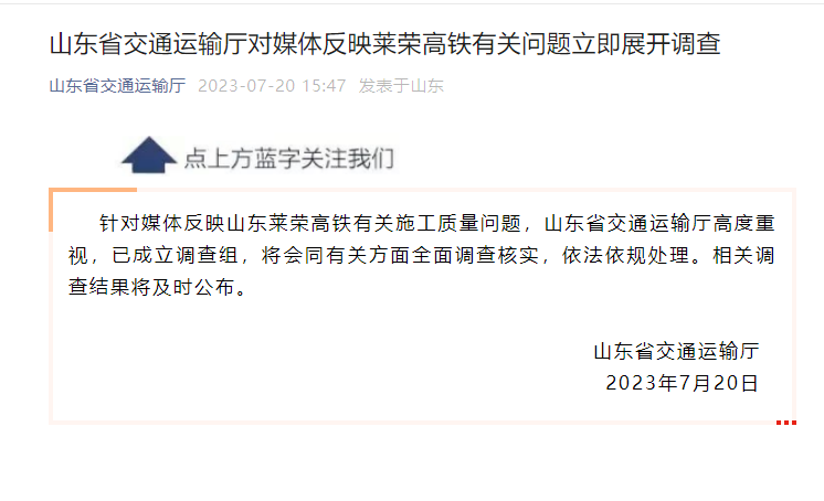 針對(duì)媒體反映山東萊榮高鐵有關(guān)施工質(zhì)量問(wèn)題,山東省交通運(yùn)輸廳高度重視,已成立調(diào)查組,將會(huì)同有關(guān)方面全面調(diào)查核實(shí),依法依規(guī)處理。相關(guān)調(diào)查結(jié)果將及時(shí)公布。