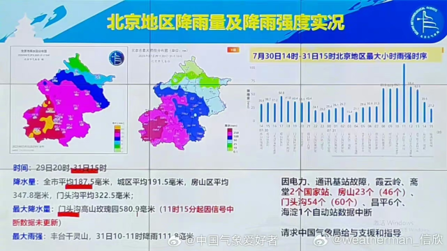微博賬號“中國氣象愛好者”發(fā)布消息稱,北京西部大量氣象站因特大暴雨導(dǎo)致電力通信和設(shè)備故障失聯(lián) 來源:微博