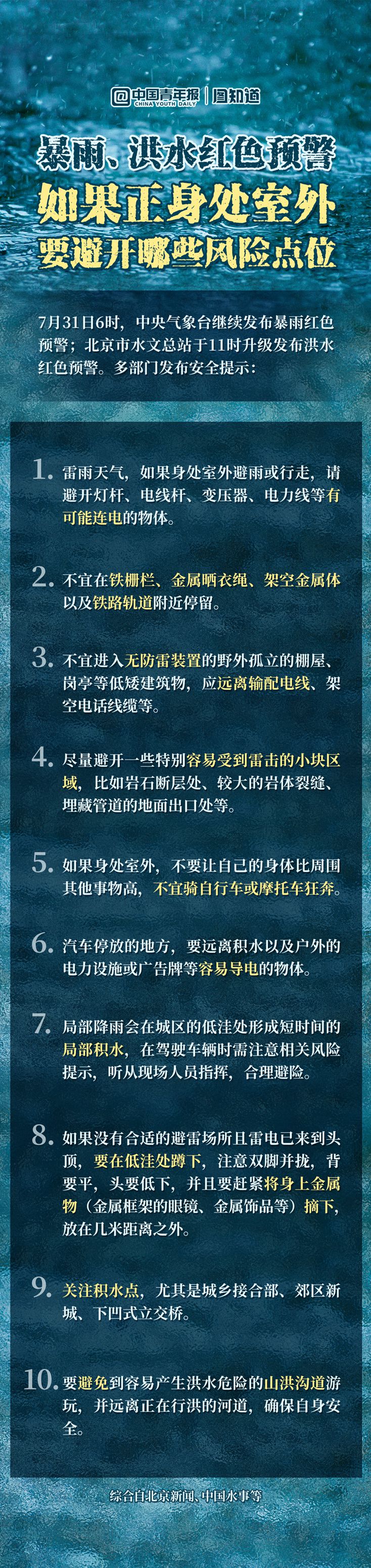 7月31日6時(shí),中央氣象臺(tái)繼續(xù)發(fā)布暴雨紅色預(yù)警。北京市水文總站于當(dāng)日11時(shí)升級(jí)發(fā)布洪水紅色預(yù)警。如果遇到暴雨、洪水時(shí)恰好身處室外,應(yīng)避開(kāi)哪些風(fēng)險(xiǎn)點(diǎn)位?學(xué)習(xí)科普知識(shí),安全度汛。
