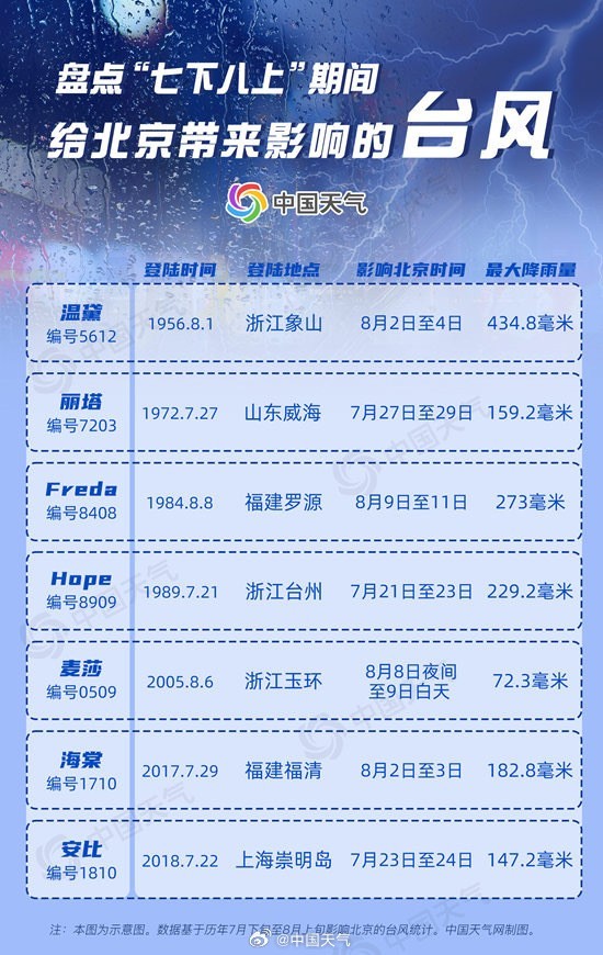本次極端降水過程中,臺(tái)風(fēng)“杜蘇芮”的殘余環(huán)流北上是其中一個(gè)重要的原因。歷史上北京也曾多次受到臺(tái)風(fēng)及其減弱后的低壓影響,出現(xiàn)較強(qiáng)降雨。例如2017年第10號(hào)臺(tái)風(fēng)“海棠”和2018年第10號(hào)臺(tái)風(fēng)“安比”給北京帶來的最大降雨量都超過了100毫米,更早的1956年第12號(hào)臺(tái)風(fēng)“溫黛”導(dǎo)致的最大降雨量更是超過400毫米。