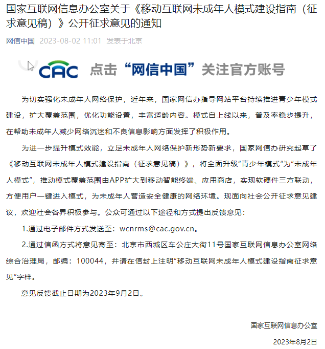 國家互聯(lián)網(wǎng)信息辦公室關于《移動互聯(lián)網(wǎng)未成年人模式建設指南(征求意見稿)》公開征求意見的通知