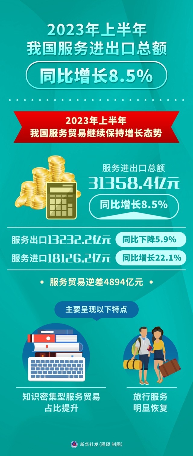 新華社北京8月3日電(記者謝?,帲┥虅?wù)部3日發(fā)布數(shù)據(jù)顯示,2023年上半年,我國服務(wù)貿(mào)易繼續(xù)保持增長態(tài)勢。服務(wù)進出口總額31358.4億元,同比增長8.5%。