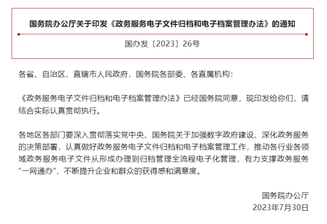 新華社北京8月22日電(記者孫廣見)日前,國務(wù)院辦公廳印發(fā)《政務(wù)服務(wù)電子文件歸檔和電子檔案管理辦法》(以下簡稱《辦法》),推動解決政務(wù)服務(wù)電子文件單套歸檔“最后一公里”問題,得到各方普遍好評。
