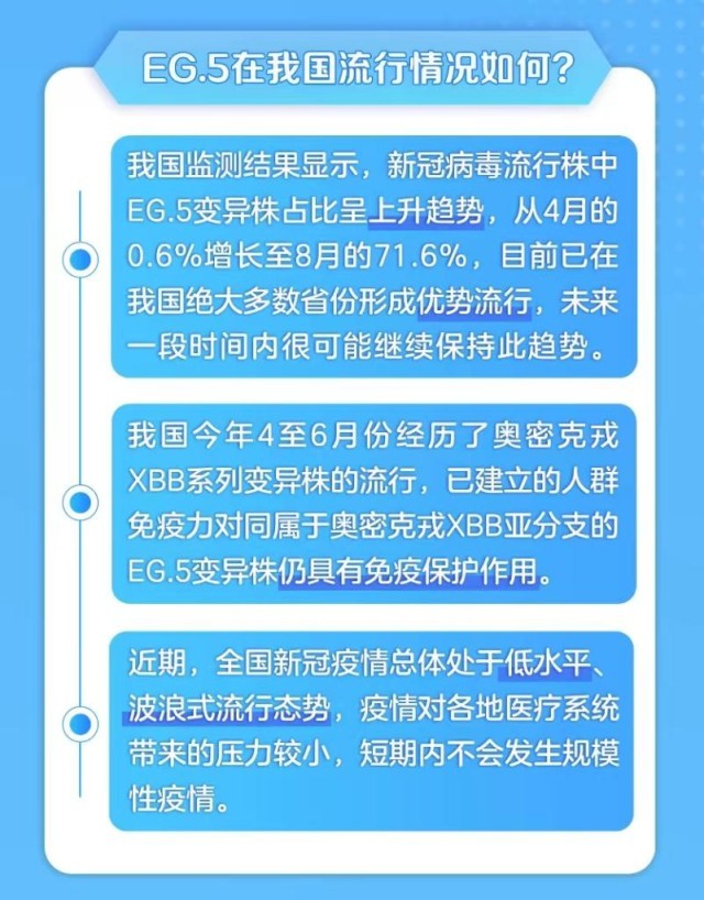 根據(jù)我國(guó)最新監(jiān)測(cè)數(shù)據(jù),新冠病毒流行株中EG.5變異株占比呈上升趨勢(shì),從4月的0.6%增長(zhǎng)至目前的71.6%,已在我國(guó)絕大多數(shù)省份形成優(yōu)勢(shì)流行,未來一段時(shí)間內(nèi)很可能繼續(xù)保持此趨勢(shì)。對(duì)此,國(guó)家疾控局表示,EG.5感染者與其他XBB亞分支感染者的臨床分型無明顯差異,近期全國(guó)新冠疫情總體處于低水平、波浪式流行態(tài)勢(shì),對(duì)各地醫(yī)療系統(tǒng)帶來的壓力較小。