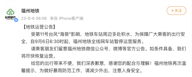 央視網(wǎng)消息:據(jù)@福州地鐵 微博消息,受第11號(hào)臺(tái)風(fēng)“??庇绊懀罔F車(chē)站周邊多處積水,為保障廣大乘客的出行安全,自9月6日6:30時(shí)起,福州地鐵全線(xiàn)網(wǎng)車(chē)站暫停運(yùn)營(yíng)服務(wù)。如條件具備,將盡快恢復(fù)運(yùn)營(yíng)。