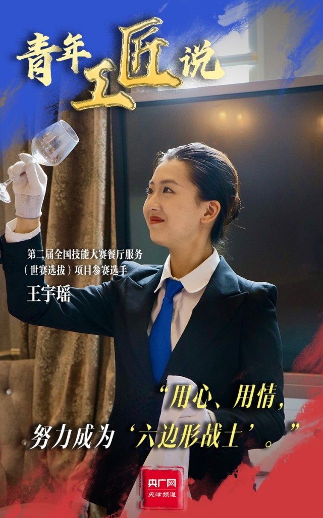 370余個(gè)考核點(diǎn),對于第二屆全國技能大賽餐廳服務(wù)(世賽選拔)項(xiàng)目參賽選手王宇瑤來說,有著巨大的考驗(yàn)。但面對困難,王宇瑤始終保持微笑,在老師的指導(dǎo)下練習(xí)調(diào)制雞尾酒、餐巾折花、餐桌擺盤成百上千次。整齊的著裝、得體大方的儀容、神采奕奕的狀態(tài),一顰一笑皆為王宇瑤的細(xì)心巧思?!拔覍⒁源舜伪荣悶槠鯔C(jī),努力磨煉技藝,成為一名全面發(fā)展的‘六邊形戰(zhàn)士’?!蓖跤瞵幮χf道。