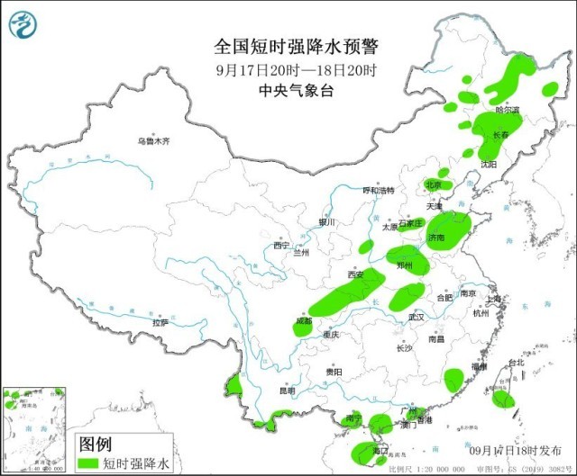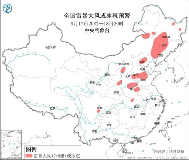 中央氣象臺9月17日18時(shí)繼續(xù)發(fā)布強(qiáng)對流天氣藍(lán)色預(yù)警