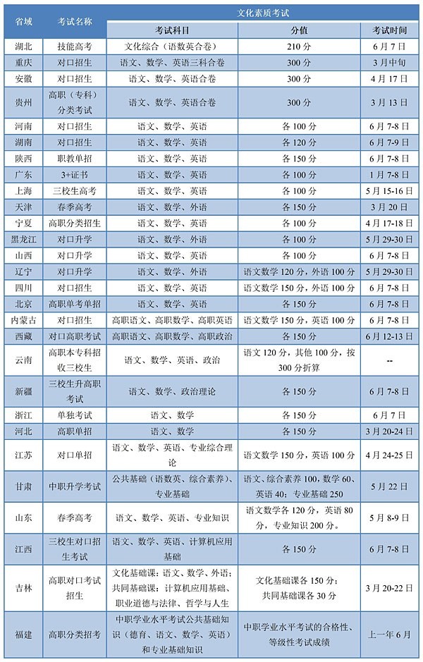 截至2021年,姜蓓佳博士收集到的各省“職教高考”的名稱、內容、分值、時間。摘自姜蓓佳博士論文《職教高考制度構建研究》